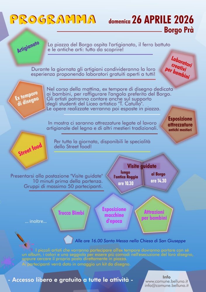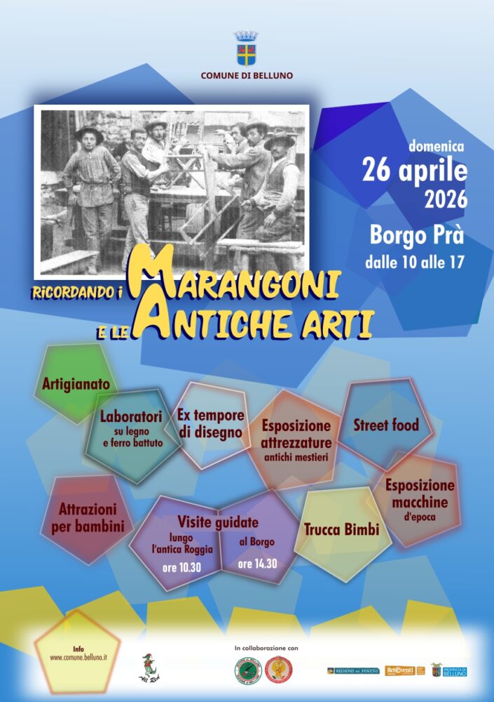 Domenica 26 aprile 2026, nella suggestiva cornice di Borgo Prà a Belluno, torna l’evento “Ricordando i Marangoni e le Antiche Arti”, una giornata dedicata all’artigianato e alle tradizioni locali promossa dal Comune di Belluno.